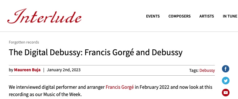 Je suis heureux de vous annoncer que je suis music of the week avec mes orchestrations de Claude Debussy. Lisez l’article sur le site Interlude.